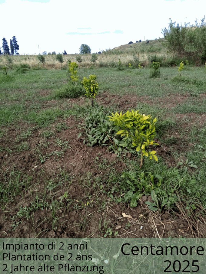 Stato agosto 2018: Le piante hanno passato un brutto anno, in parte per una mancata tempestività di intervento da parte di Paolo nella cura degli alberelli principalmente per motivi legati all'approvvigionamento idrico, in parte dovuta ad una serie di avversità climatiche che hanno infierito su di loro (gli eventi climatici straordinari degli ultimi anni si sono abbattuti violentemente in quella zona). L'impianto ad oggi si presenta mal messo e le piante quasi sicuramente ritarderanno di qualche anno l'entrata in produzione.