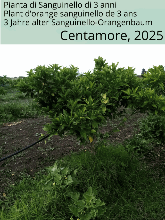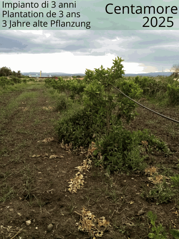 Stato agosto 2018: Periodo delicato per piante giovani (sole diretto, vento caldo, carenze idriche). Negli impianti Morabito e Cutuli le piante di due anni hanno iniziato a produrre dei frutti. I due produttori hanno seguito tecniche diverse: Morabito ha rimosso frutticini per stimolare vegetazione, Cutuli li ha lasciati con arresto vegetativo iniziale poi ripreso.