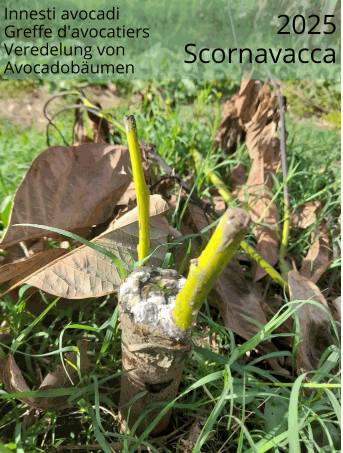 Stato novembre 2017: Le piante sono state comprate presso due vivai per compararne la qualità in vista di futuri acquisti. Le piante sono di tre varietà, Hass, Bacon e Fuerte. Le Bacon e Fuerte sono state impiantate in numero molto inferiore rispetto all'Hass per avere un po’ di avocadi in anticipo e soprattutto come impollinatori.